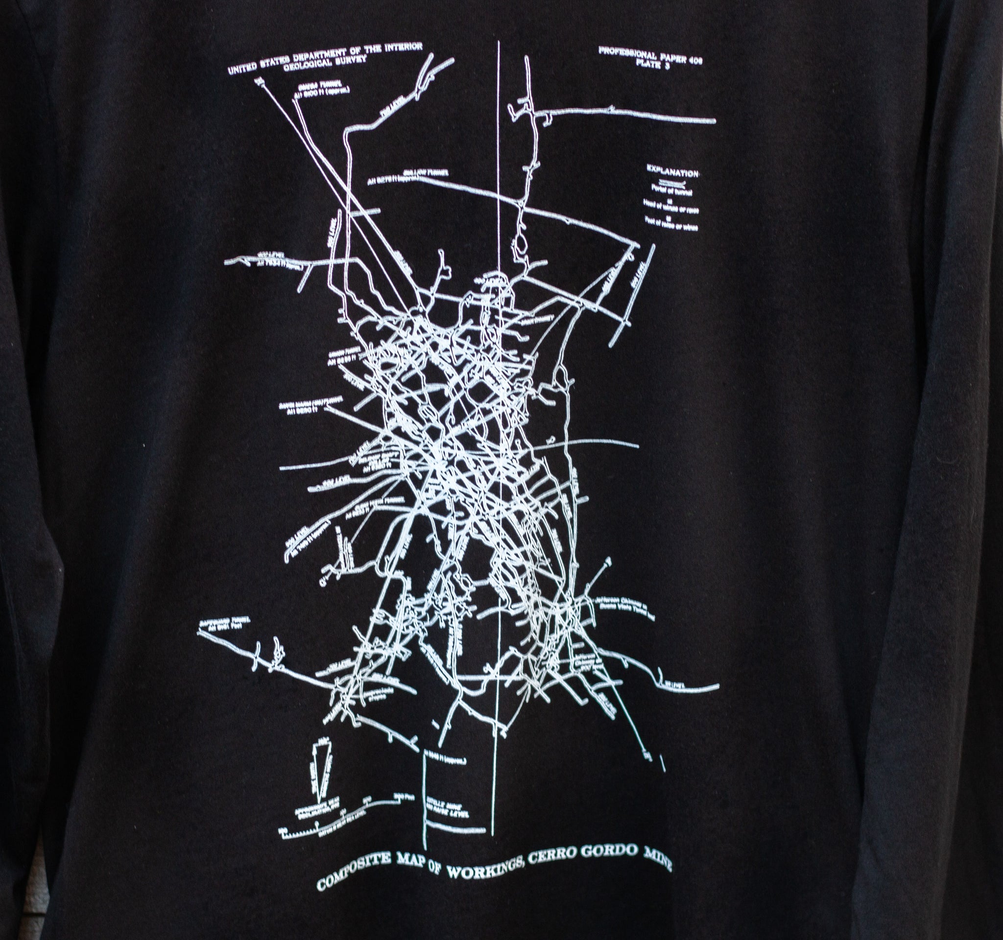 Black long sleeve shirt with the composite map of Cerro Gordo Mines in white.
