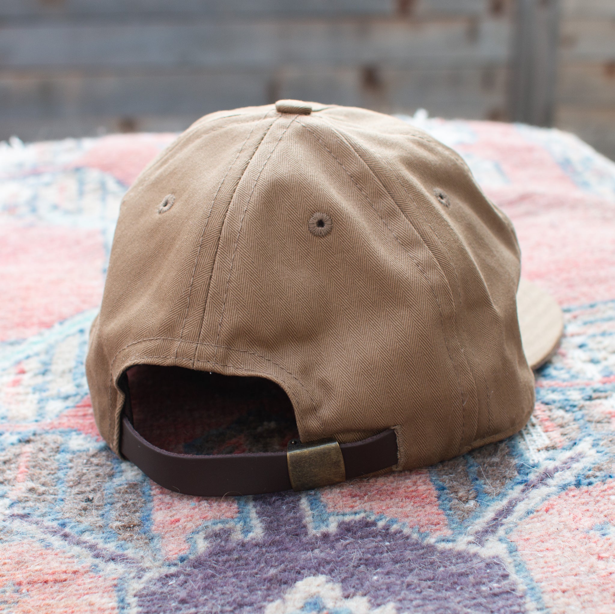 Tan unstructured hat with Cerro Gordo patch on the front, complete with a leather strap back.