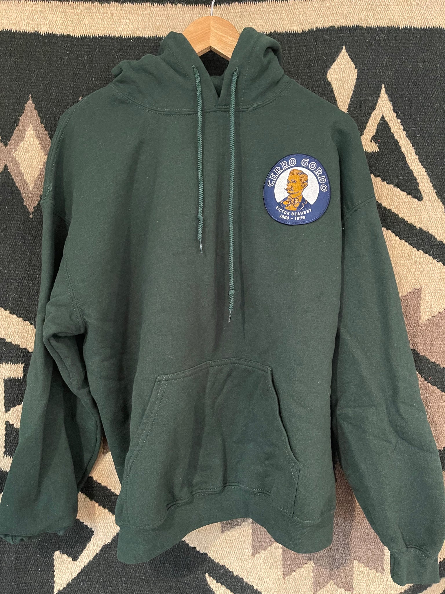 Hunter green with large Cerro Gordo logo on back in yellow.